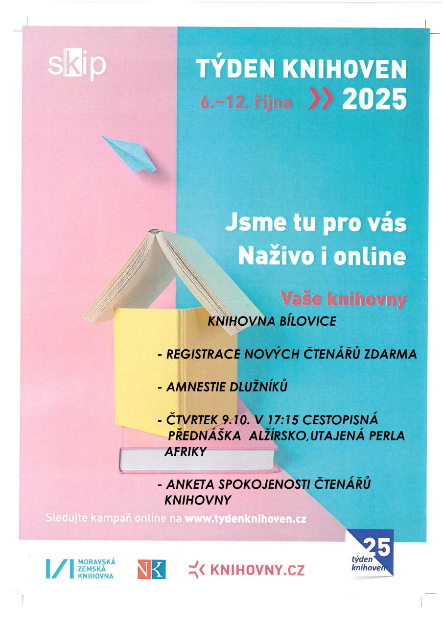 Ve čtvrtek 25.9. bude knihovna otevřena od 8.00 do 12.00.